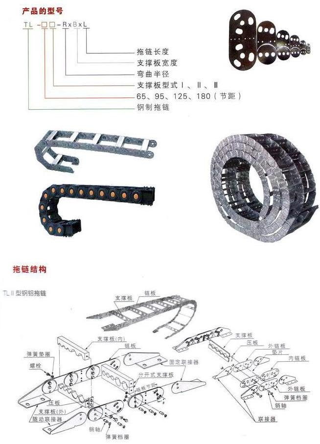 TL系列鋼制電纜拖鏈,銷軸及支撐板和隨動連接器等零件組成。拖鏈可適用最大移動速度為40米/分,拖鏈安全使用壽命不少于100萬次(往復(fù))。該產(chǎn)品具有設(shè)計精巧、使用靈活等特點,被廣泛應(yīng)用與冶金、鋼鐵、鑄造、大型機械等行業(yè)作為短距離,油、氣、水軟管和電纜同時移動之用。