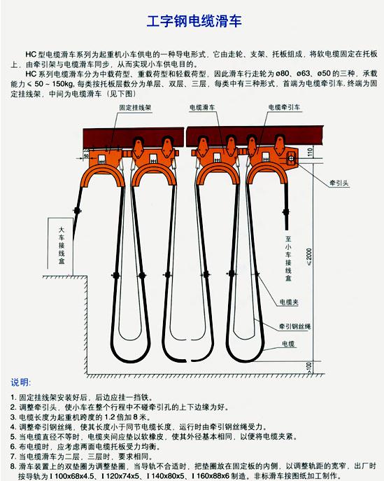 三、ZYGHC型系列工字鋼滑車裝置用于移動供電機(jī)械在移動中電纜的懸吊與移動,已廣泛應(yīng)用于各類起重機(jī)械中。該裝置具有結(jié)構(gòu)堅(jiān)固。移動靈活。安全可靠等優(yōu)點(diǎn)。